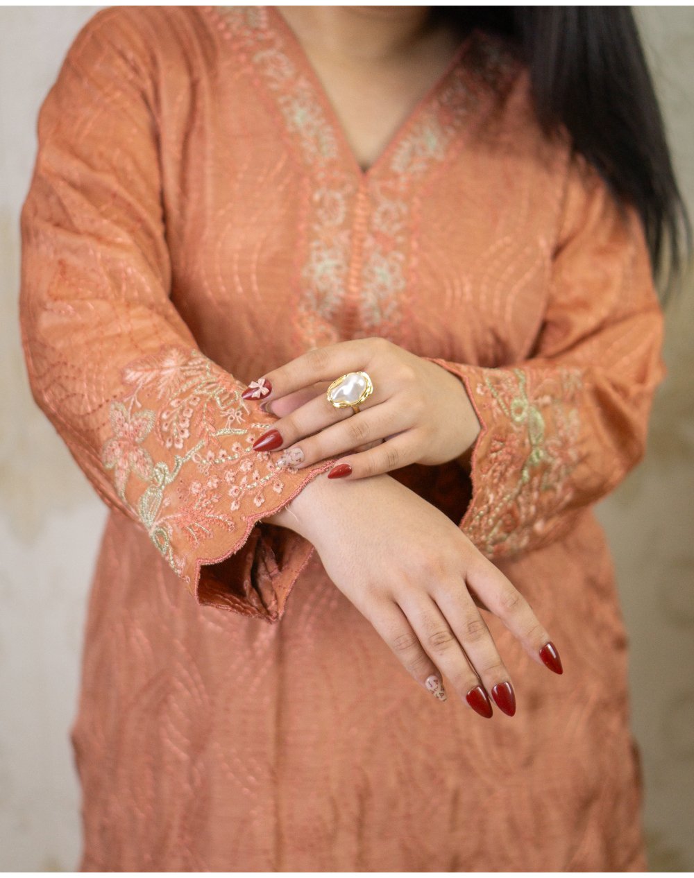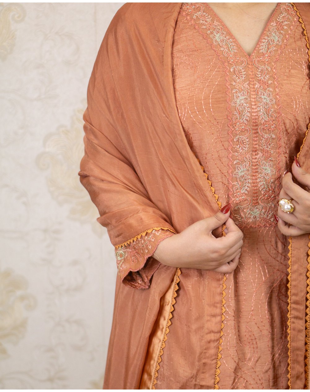 Our chikankari formal suit in Pakistan is more than just clothing — it’s wearable art. The fully embroidered shirt showcases delicate chikankari work that reflects South Asian heritage, while the premium raw silk dupatta adds a luxurious finishing touch.