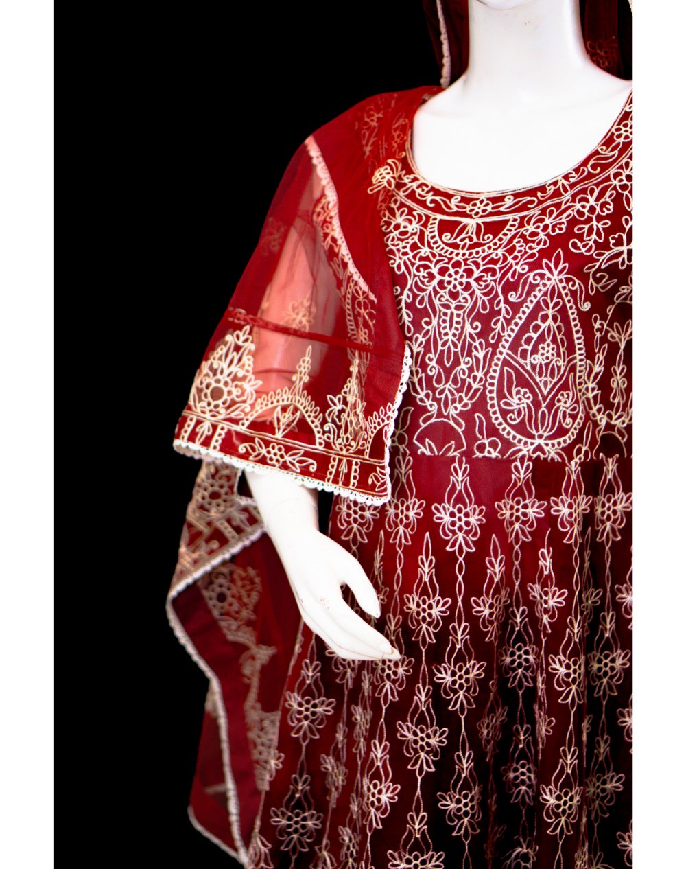 Crafted with a net base enhanced by finely worked chikankari kaliyan, this frock captures the charm of classic craftsmanship. Each kali adds movement and detail, creating a regal look that stands out effortlessly.