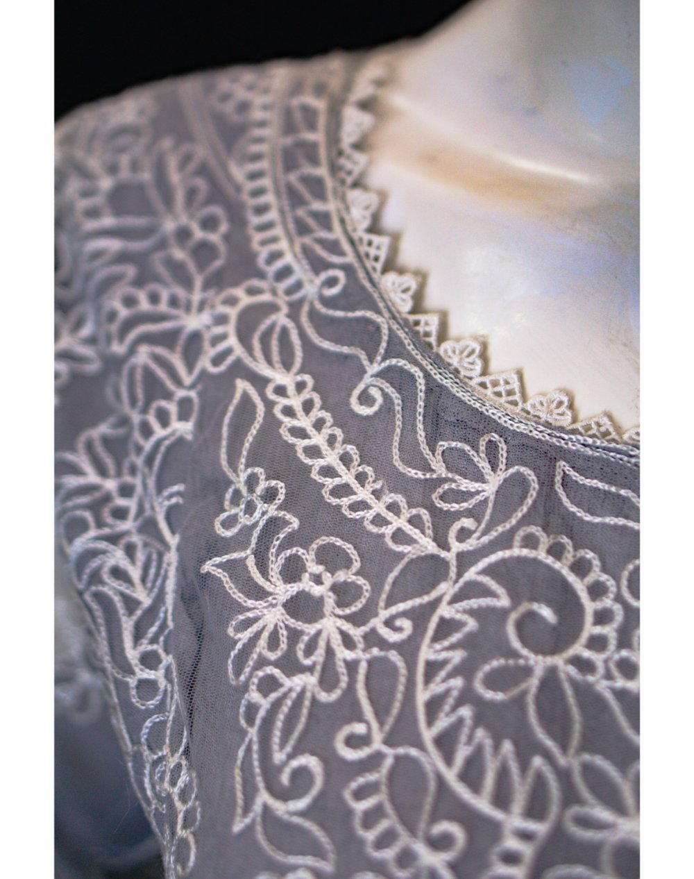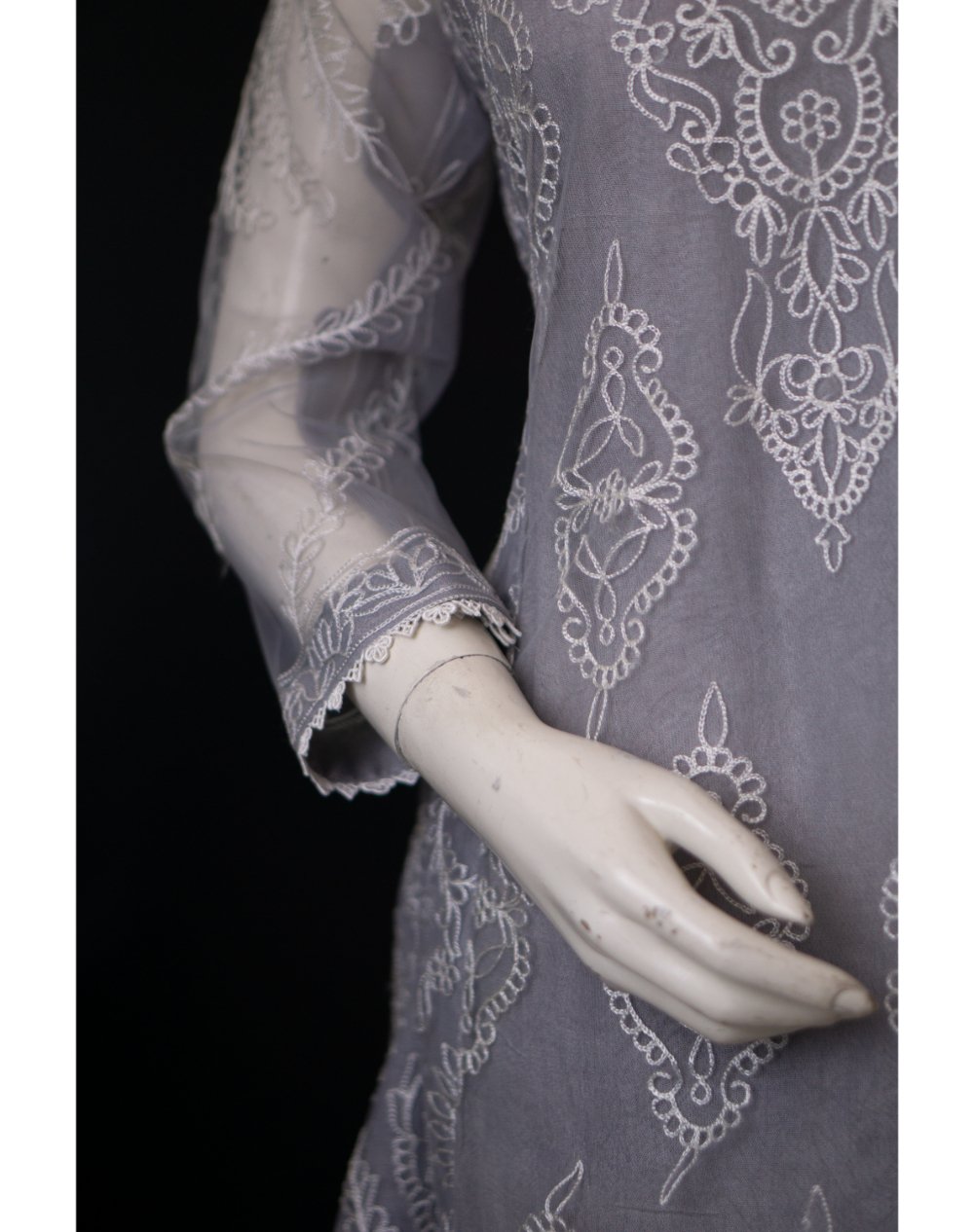 Step into refined elegance with this formal net chikankari dress in Pakistan, designed to add grace and charm to your wardrobe. This 2-piece ensemble features a kalion wali shirt crafted from delicate net fabric, adorned with intricate chikankari embroidery, giving it a flowing, flared silhouette that’s perfect for weddings, family functions, and festive dinners.