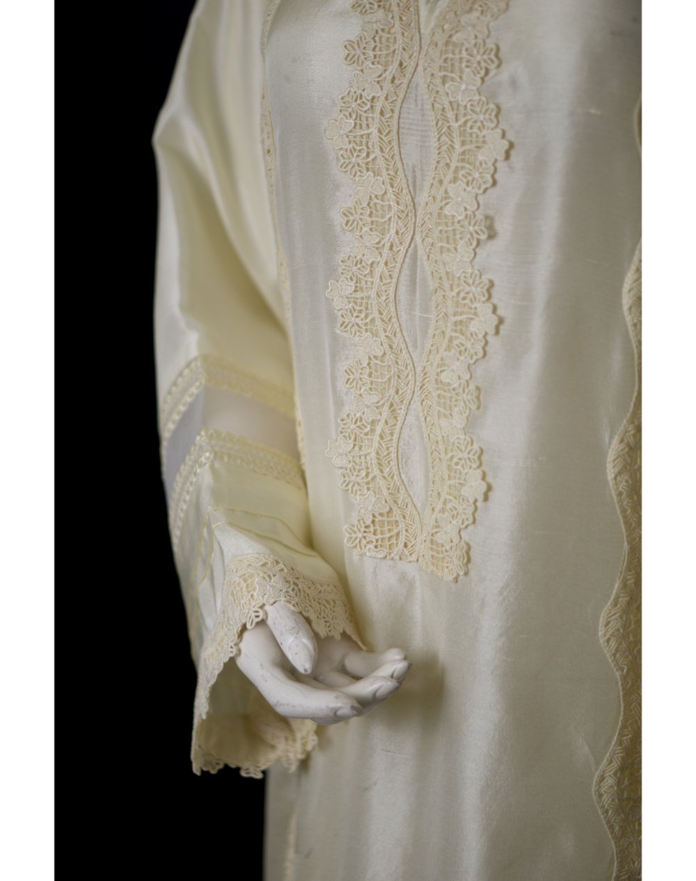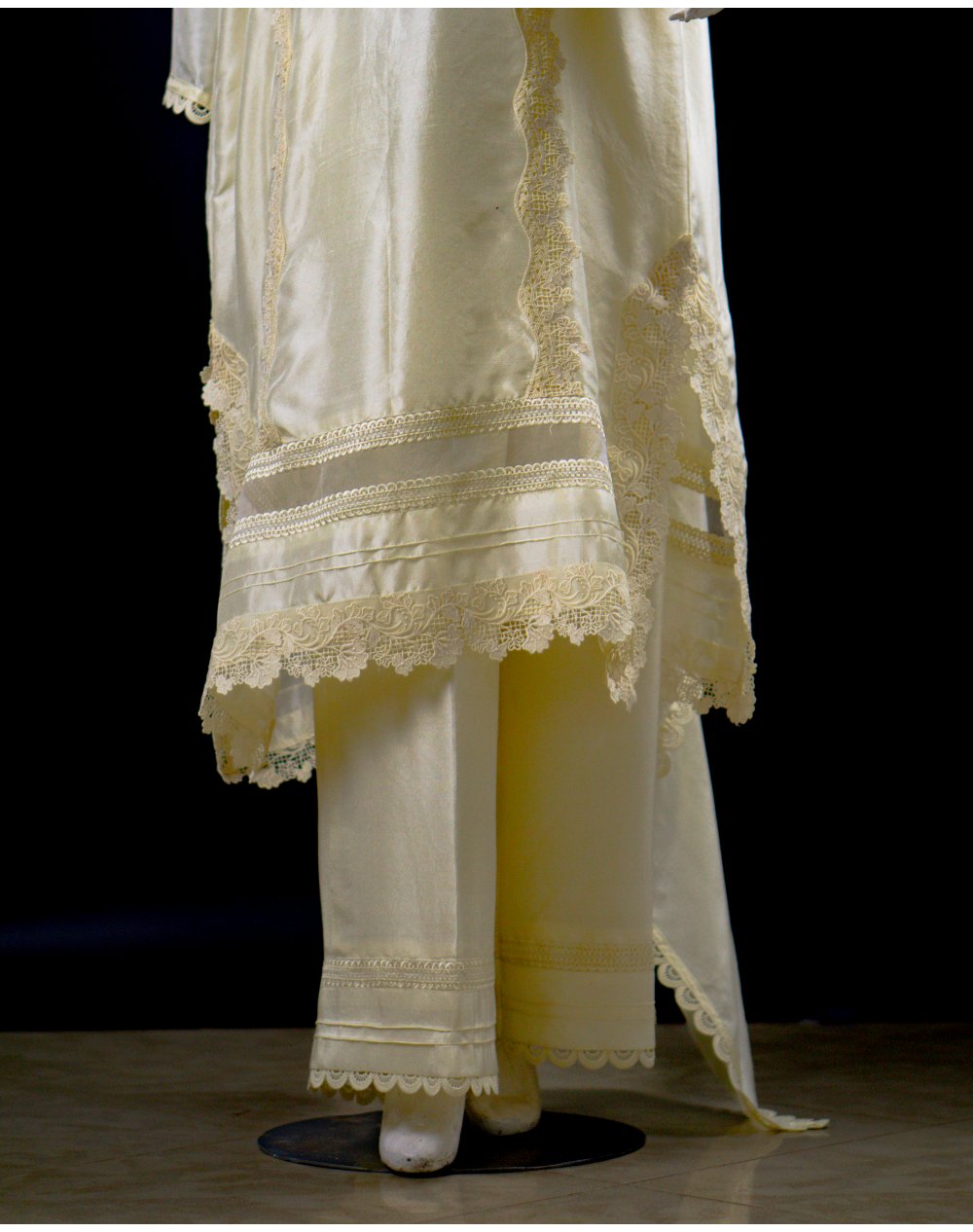 This formal raw silk suit in Pakistan features delicate lace work and precise machine embroidery on the shirt. The luxurious raw silk shirt and trouser are complemented by a medium silk dupatta, creating a complete look that radiates class and elegance.