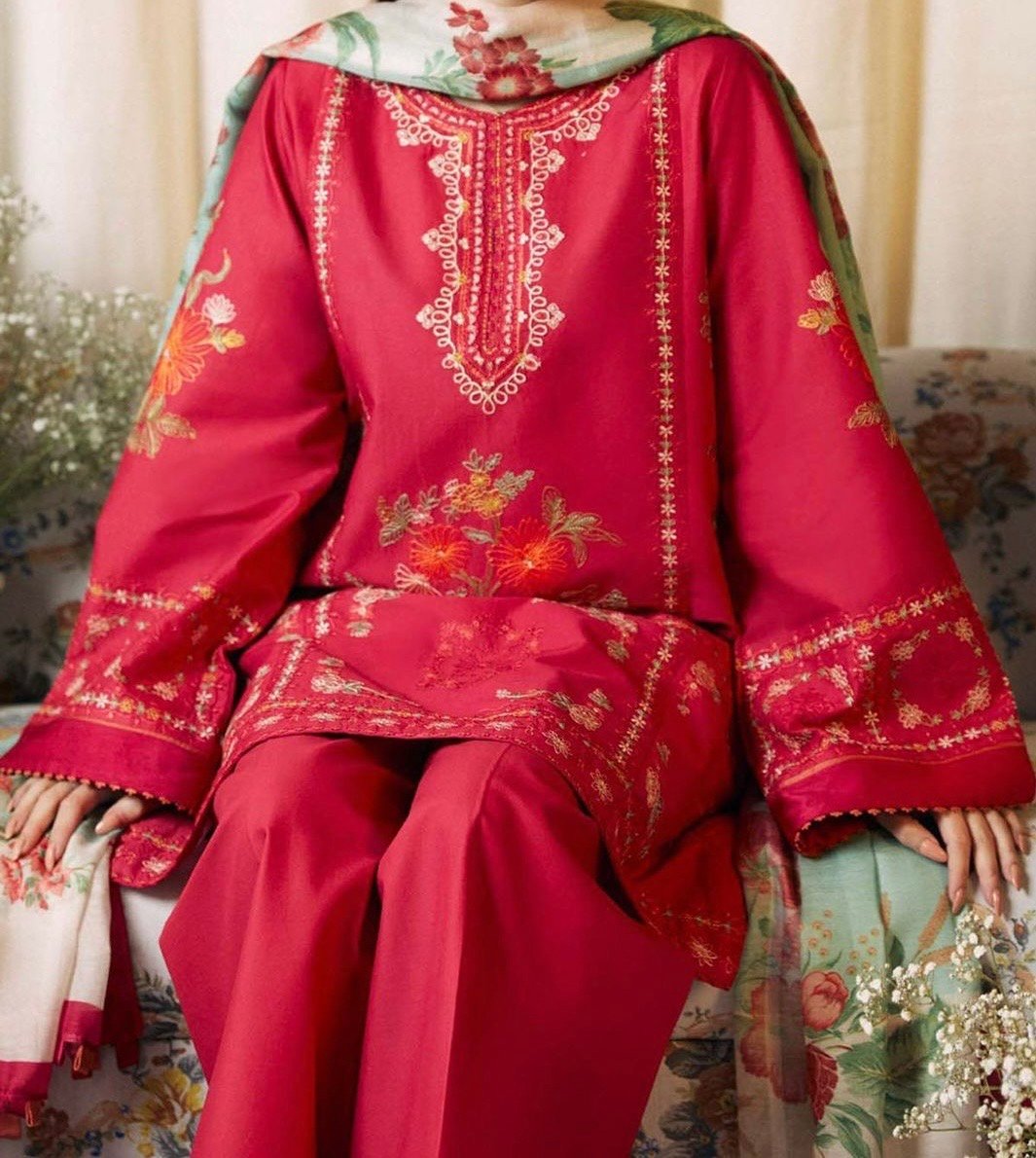 The set is completed with a voile lawn printed dupatta, adding a pop of color and pattern that ties the entire look together in a chic and fashionable way.